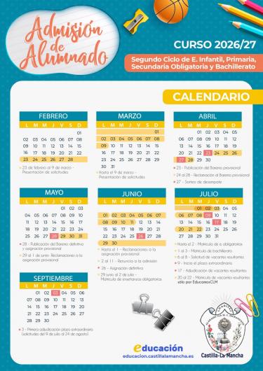 Las SOLICITUDES de ADMISIÓN para el ALUMNADO NUEVO de INFANTIL, PRIMARIA y SECUNDARIA podrán realizarse del 23 de febrero al 9 de marzo, a través de EducamosCLM. Se adjunta guía informativa para familias y calendario del proceso de admisión. Cualquier duda, pueden ponerse en contacto con la secretaría del centro a través del teléfono 949220446. Más información en: