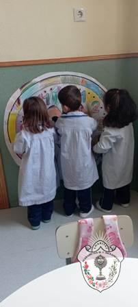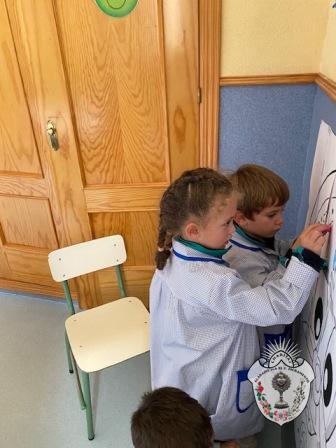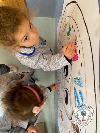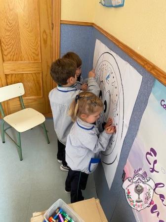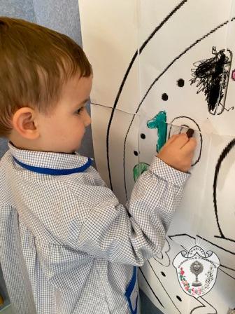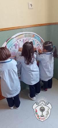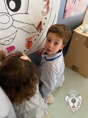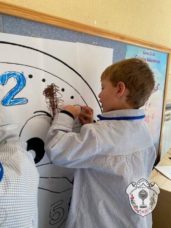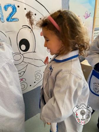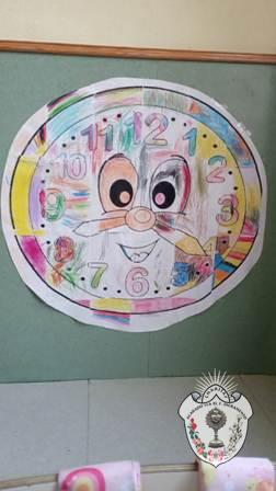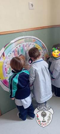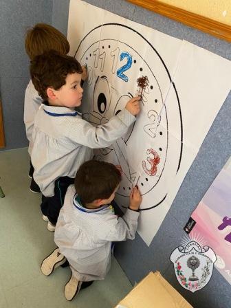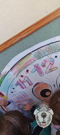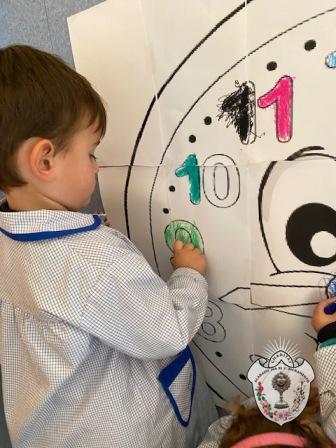 ¡Manos a la obra…. Bueno más bien, manos al puzle! Porque los alumnos de primero de Infantil han trabajado el lema del colegio a través de una actividad de carácter colaborativo en la que, cada uno ha coloreado una parte de un enorme reloj que luego hemos montado en la pared de la clase.