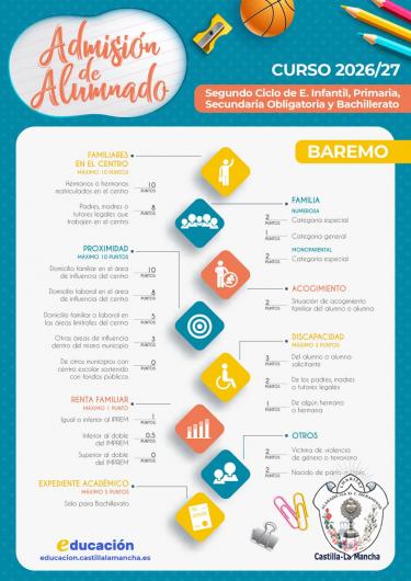Las SOLICITUDES de ADMISIÓN para el ALUMNADO NUEVO de INFANTIL, PRIMARIA y SECUNDARIA podrán realizarse del 23 de febrero al 9 de marzo, a través de EducamosCLM. Se adjunta guía informativa para familias y calendario del proceso de admisión. Cualquier duda, pueden ponerse en contacto con la secretaría del centro a través del teléfono 949220446. Más información en:
